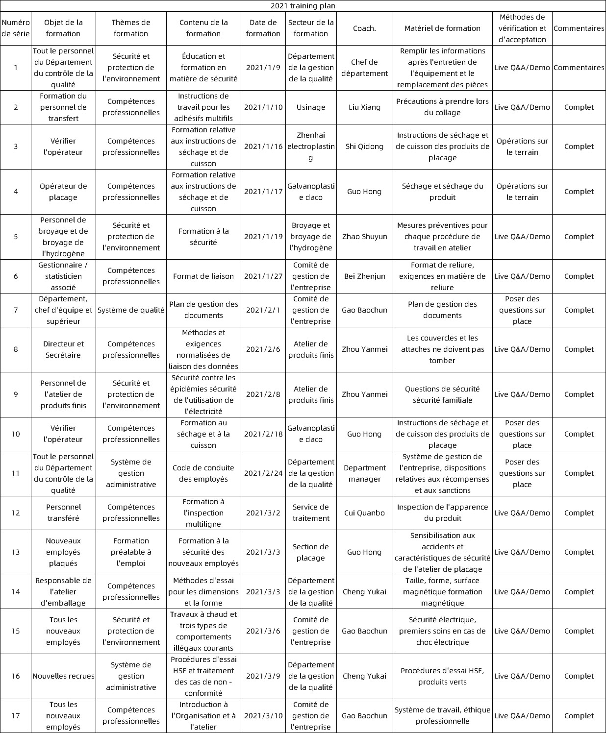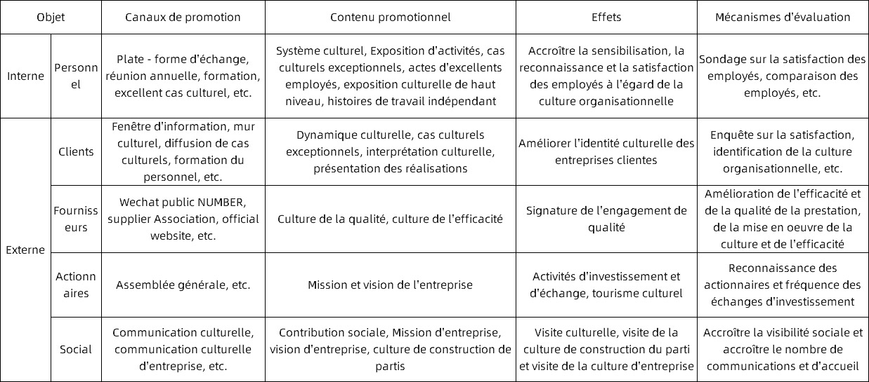 Chaque année, l'entreprise détermine les besoins de formation de chaque ministère en fonction de la situation réelle et du marché, élabore le plan de formation du personnel et le plan annuel, et assure l'éducation et la formation du personnel, y compris la sensibilisation à la qualité, les connaissances sur la qualité, le système de gestion de La qualité, les connaissances professionnelles et d'autres contenus de formation. L'entreprise élabore et publie chaque année un plan annuel de formation du personnel et organise une éducation à la qualité et à l'intégrité.